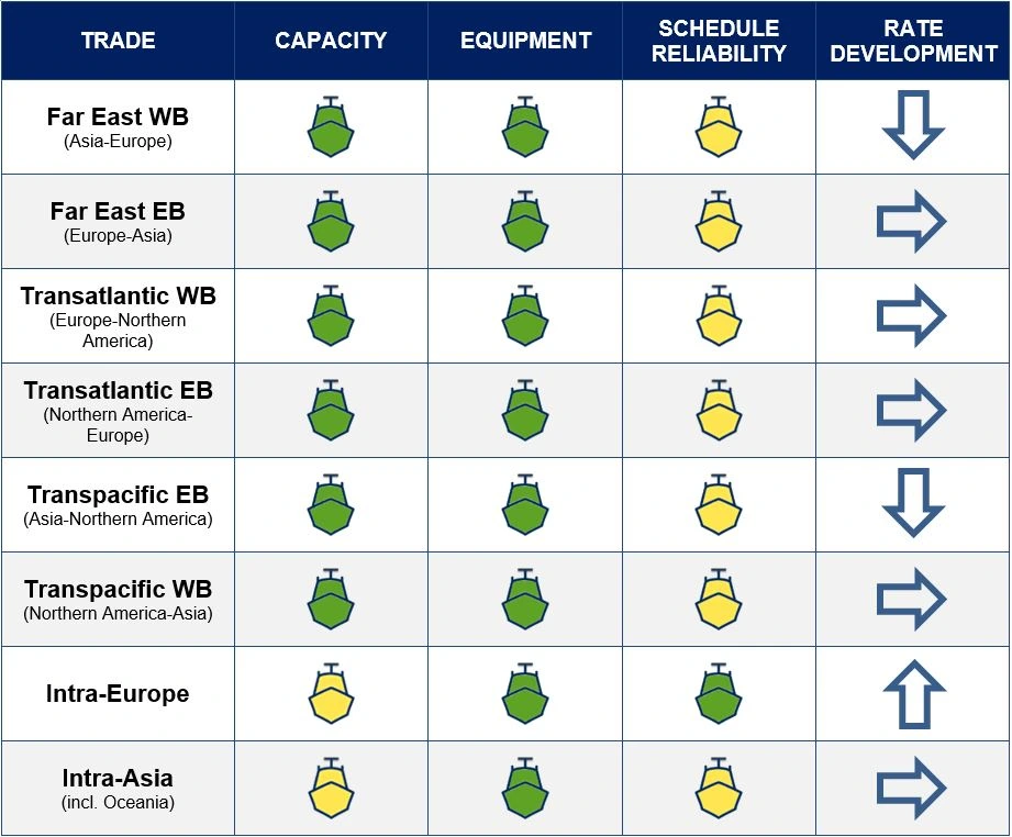 Legend: traffic lights showing current status, arrow indicates possible development of transport rates.